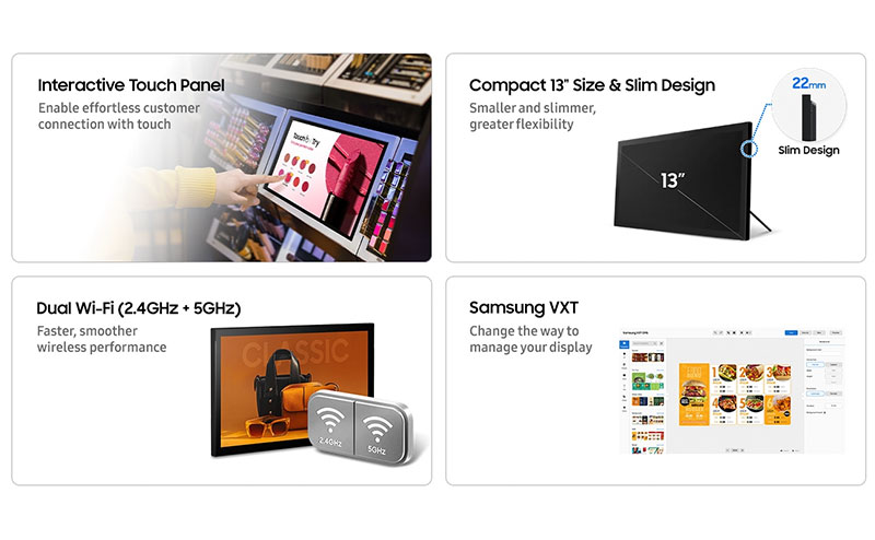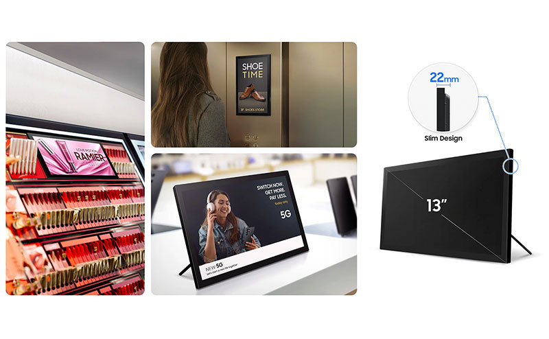 Slimmer than ever at 22mm, the 13" compact display fits flawlessly in tight spaces, perfect for maximising visibility without hindering performance. Its smaller design packs the same reliable performance businesses demand, making it a smart choice for any space.